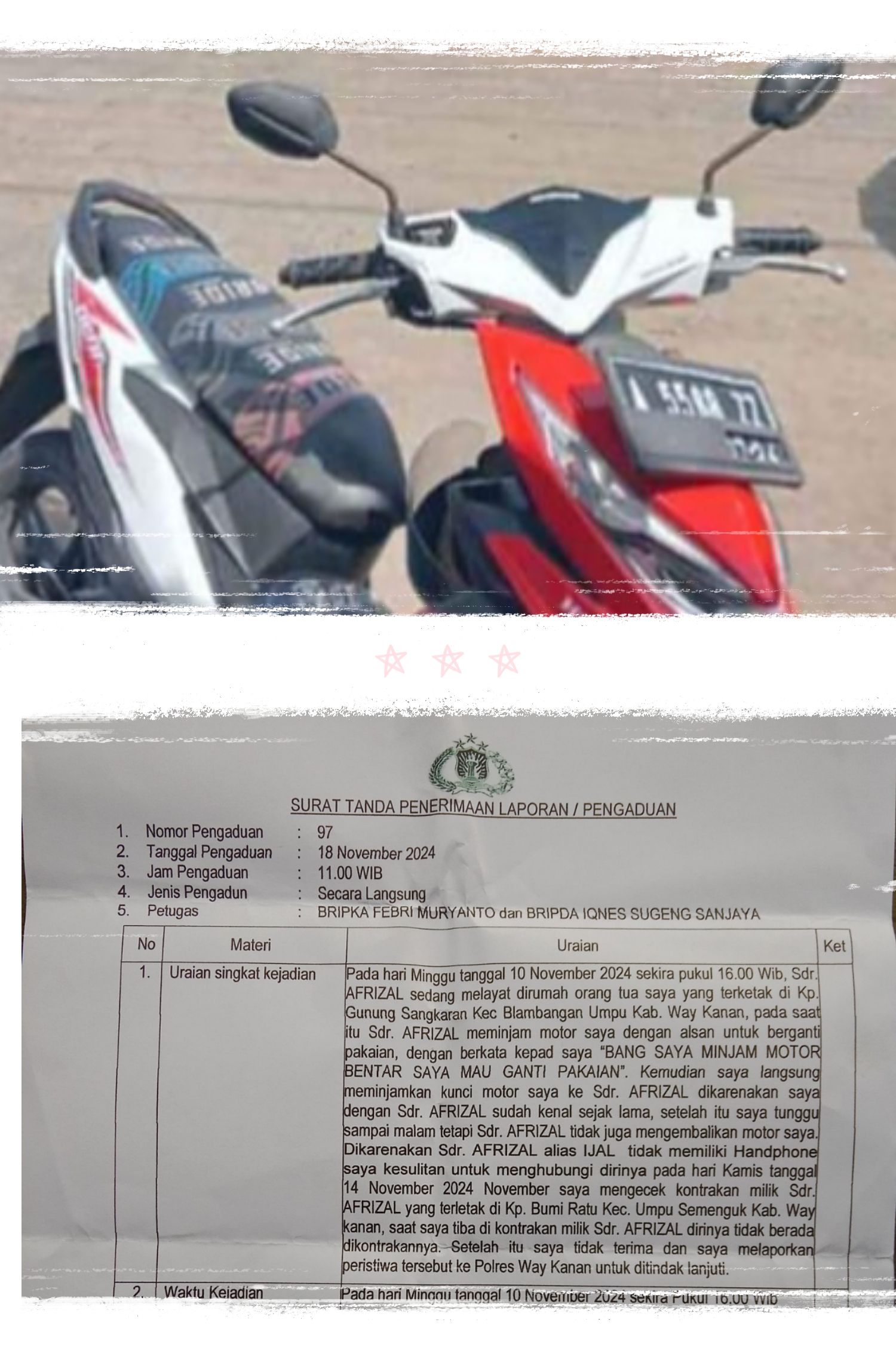 Namun Terhitung sampai hari ini sudah lebih dari seminggu Rizal tidak juga mengembalikan sepeda motor yang ia pinjam tersebut, Saat M.Yusuf mencari keberadaan Rizal dirumah kontrakannya di Bumi Ratu, M.Yusuf tidak menemukan Rizal, bahkan rumah kontrakan yang ditinggali oleh Rizal dan keluarganya tersebut telah kosong.